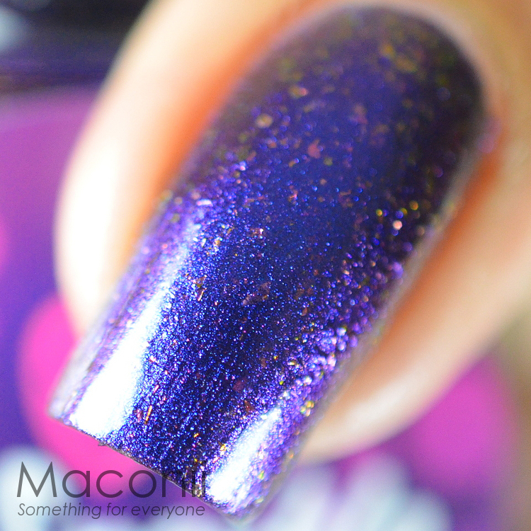 A navy-purple multichrome polish that shifts through to purple and copper with shimmering magenta flakies shifting through to bright green.