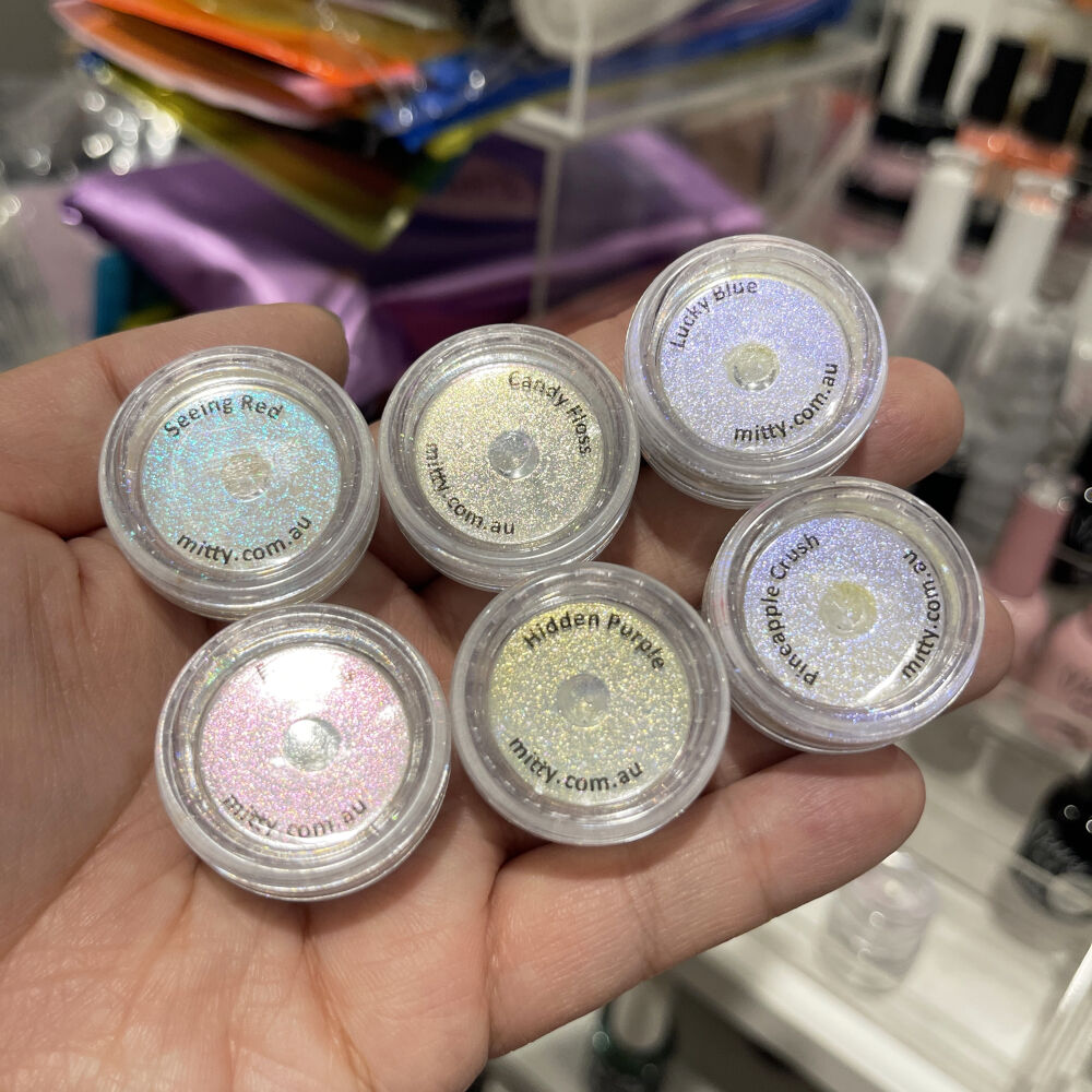 Mitty's Shimmer powders have a hidden secret. When applied, they transform into gorgeous iridescent shimmers. This set includes all six colours: