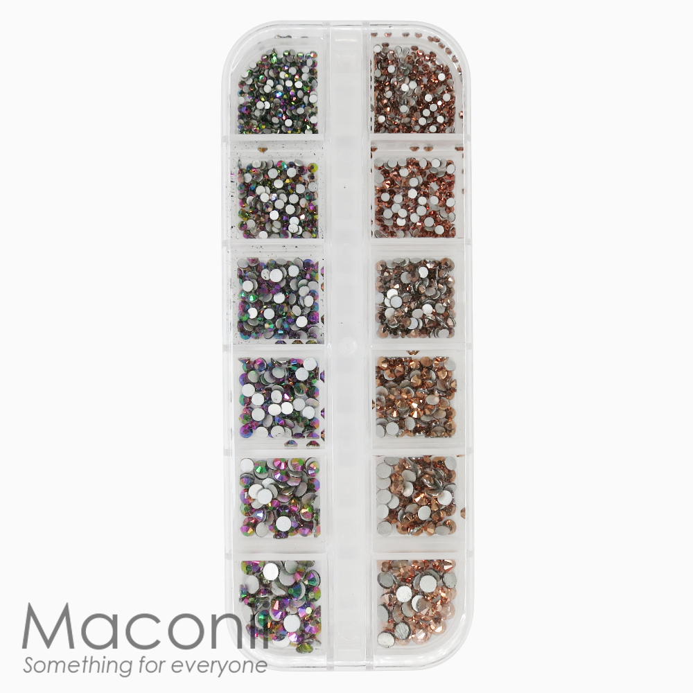 Style #12 is a set of flat back rhinestones in 2 colours; Rose Gold and Rainbow Rose Gold. There are 6 sizes of each colour: