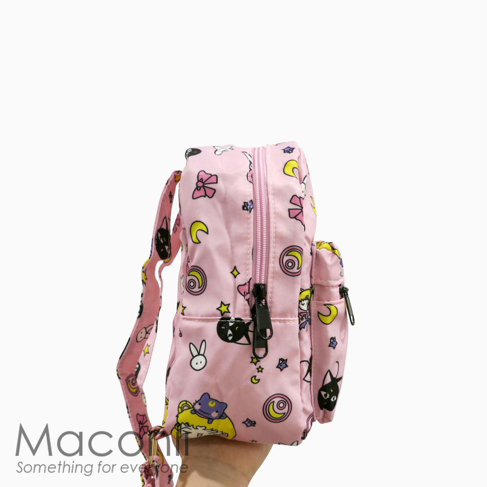 An amazing bright and fun bag made for all Sailor Moon fans! This backpack has light padding on the back and bottom for comfort, and is lined with plastic to keep your belongings dry on light rainier days. It features a large single roomy compartment to carry all your daily needs (fits A5 sized books) and contains a small zipped pocket inside to store smaller items.