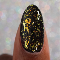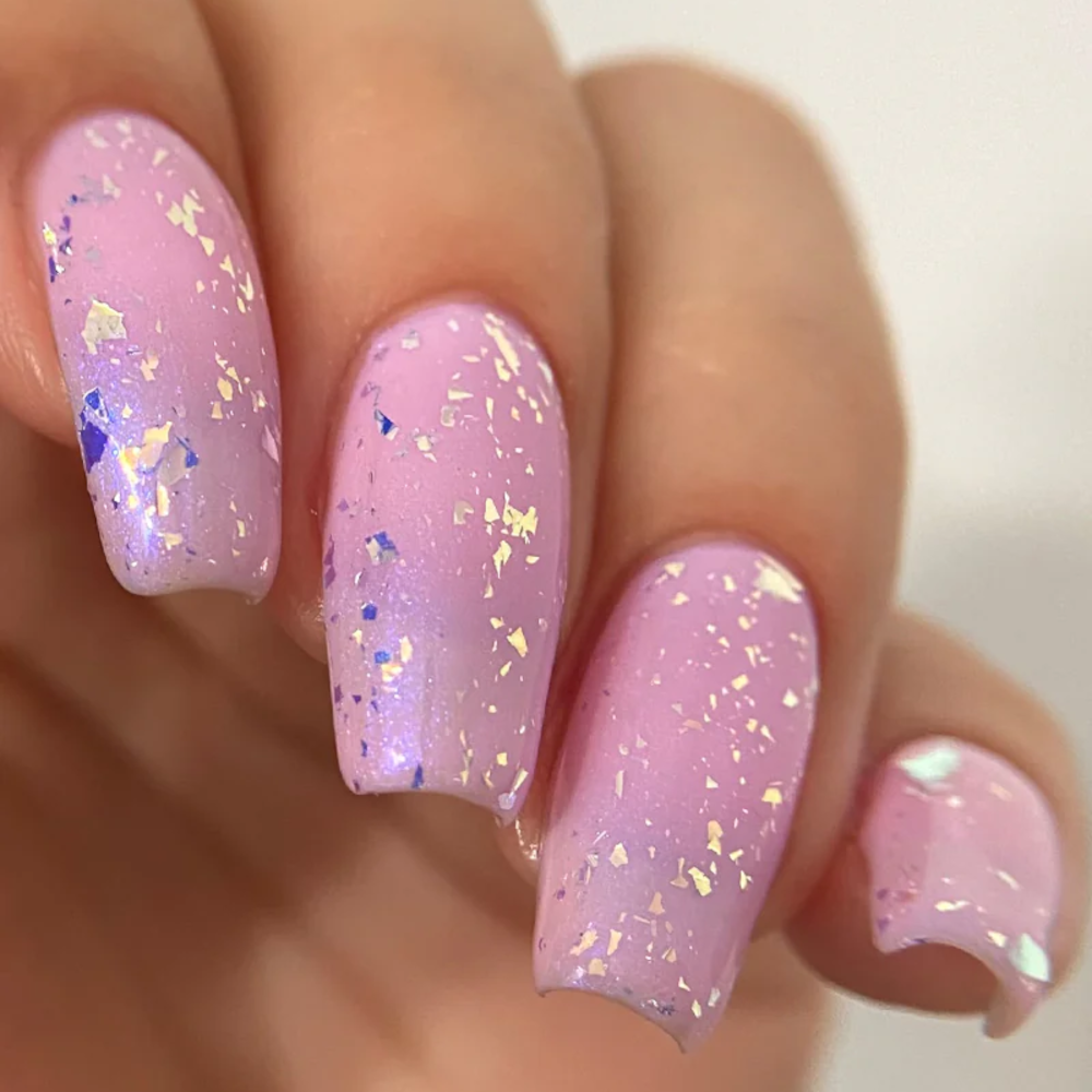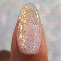 A clear golden flake topper filled with glowing, iridescent shreds in various sizes that shift between flashes of warm gold, soft periwinkle and medium blue. It gives off an eternal glow...