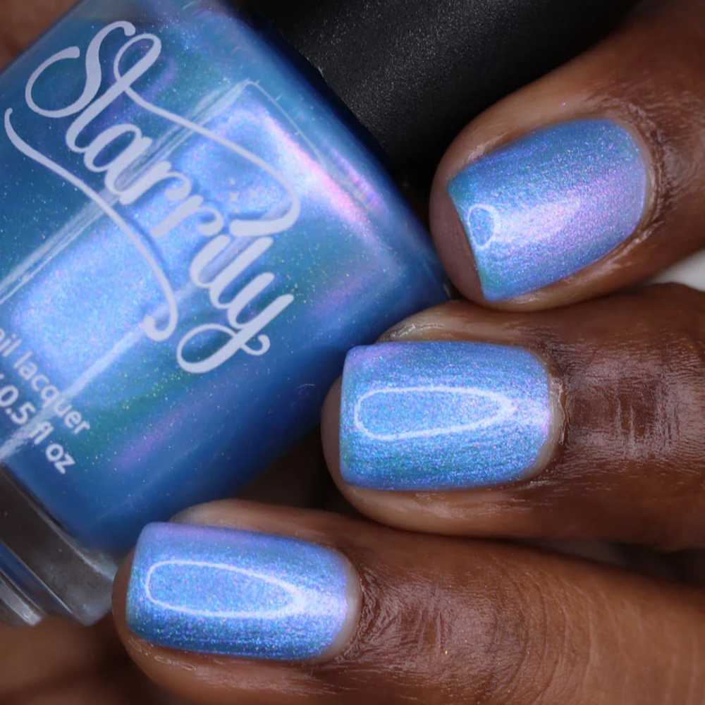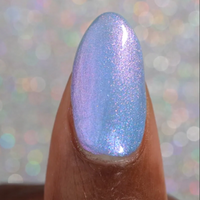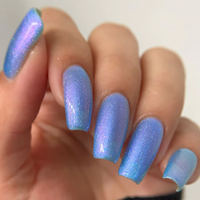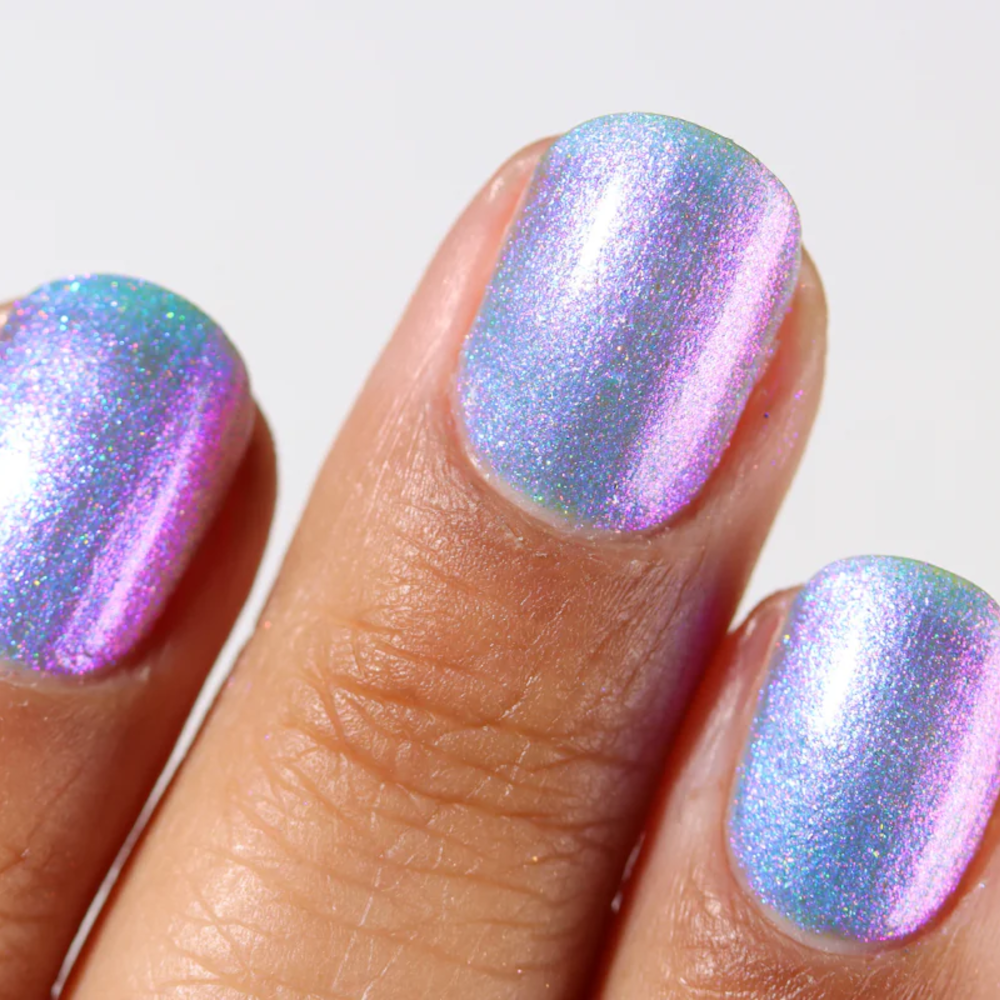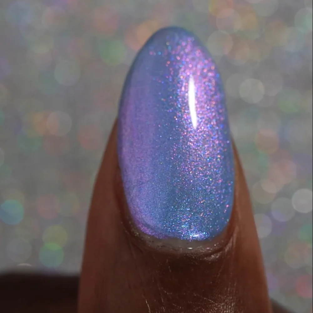 A sheer, mystical azure base packed with a dreamy blend of glowing purple, pink and blue colour shifting shimmers that transition from cornflower to fuchsia to peach in extreme angles. A fine holographic dusting is scattered throughout. Like a sky that keeps changing when you’re not looking…