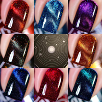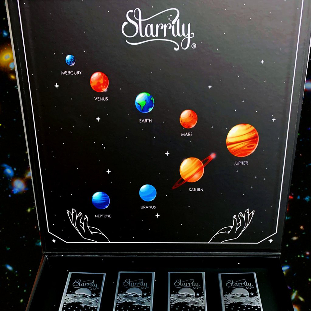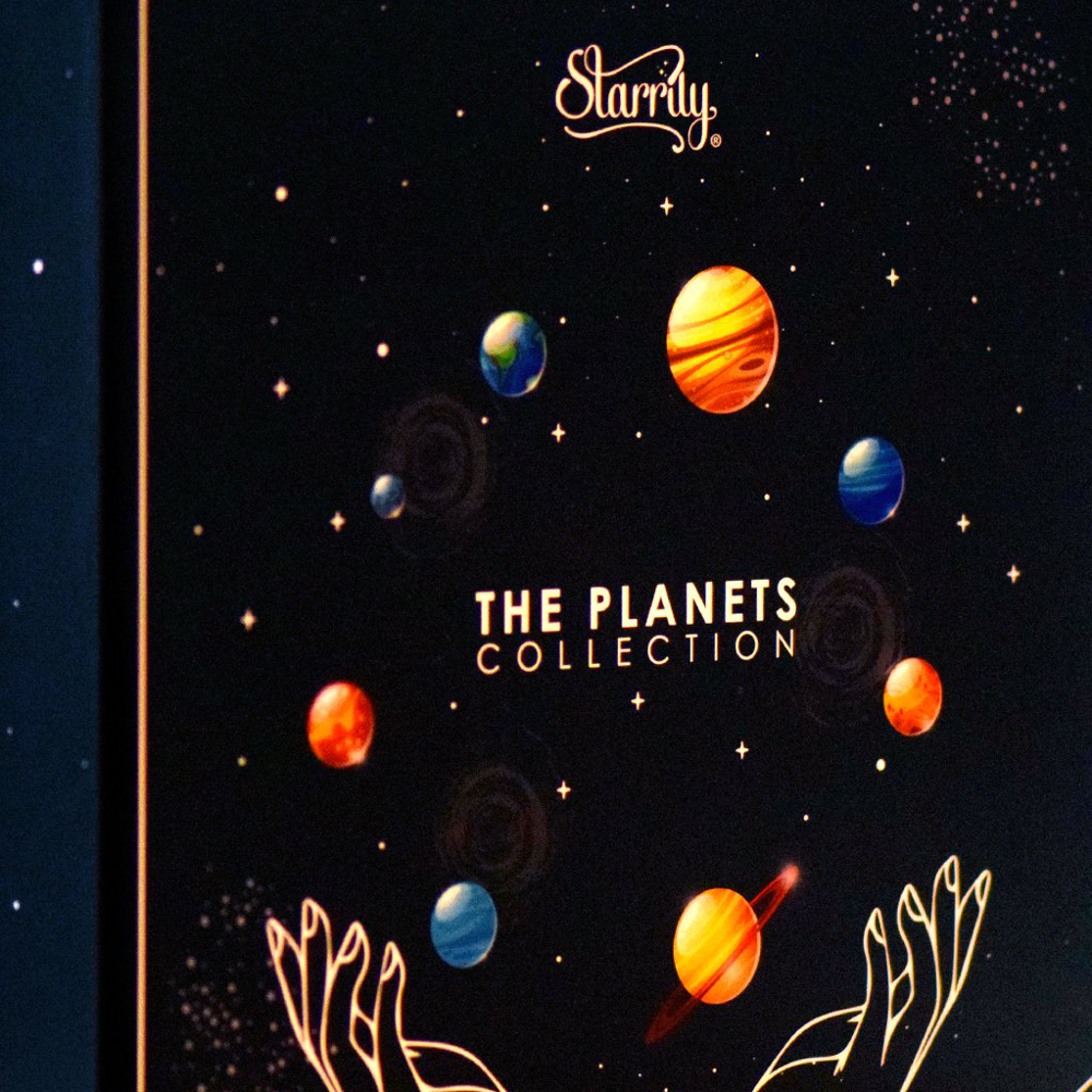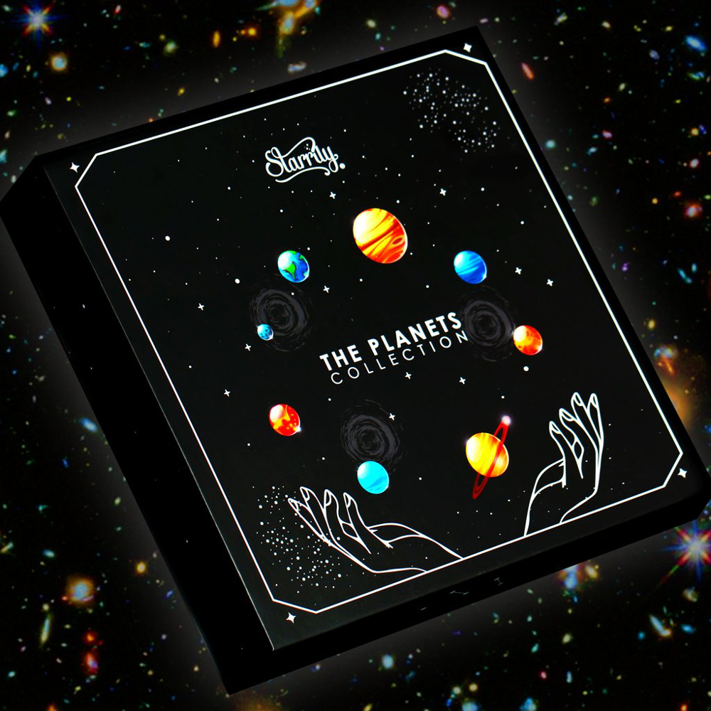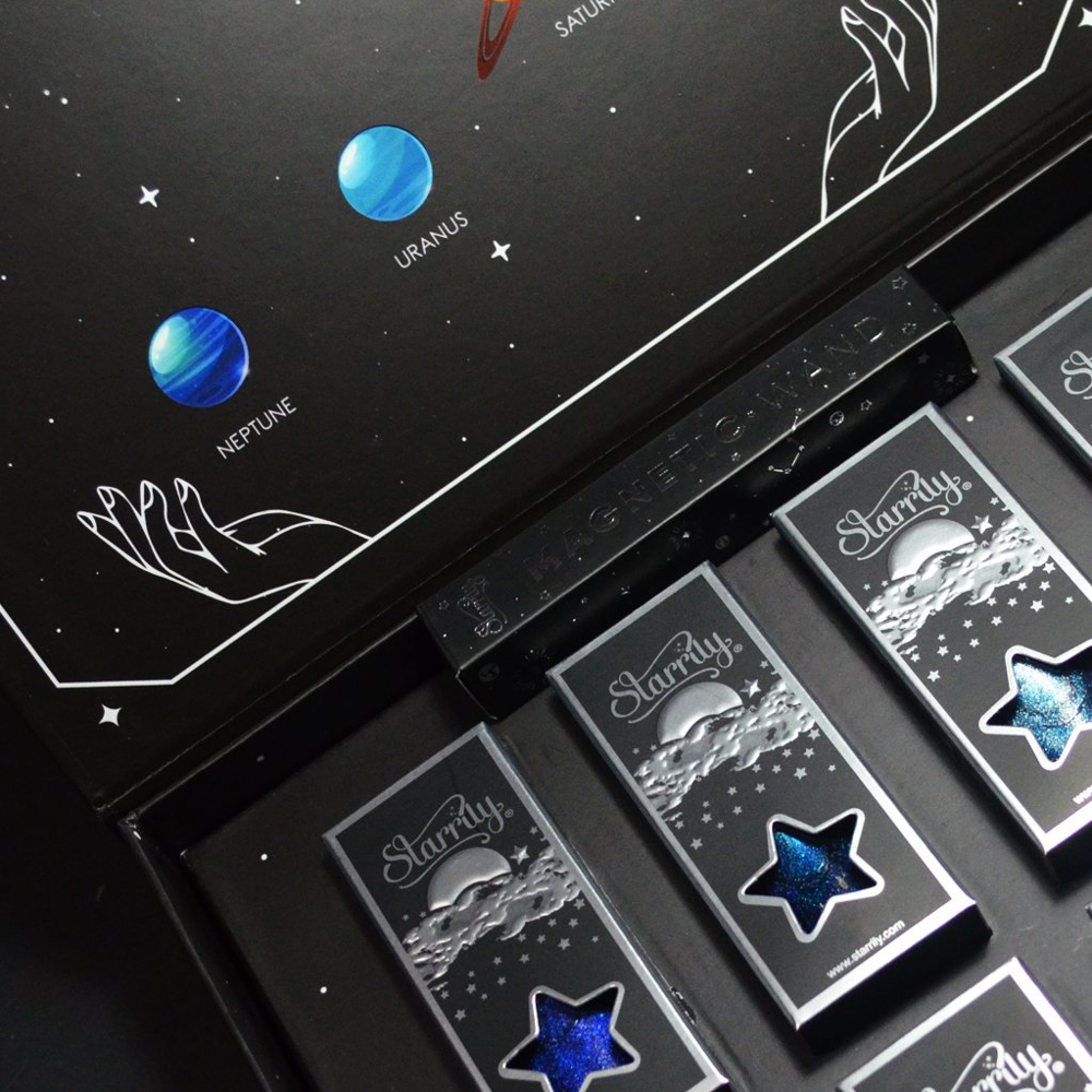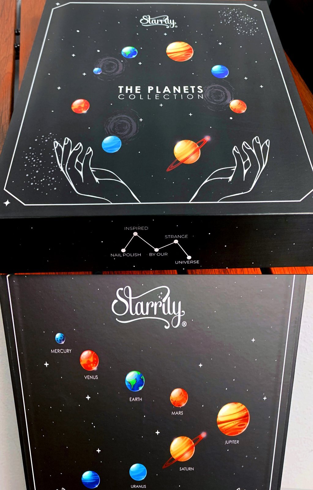 The Planets Gift Set collection comes in our first collector's gift set box. Set includes all planet gift box, 8 planet nail polishes, 2 magnetic wands with matching space designed boxes and a magnetic guide. The front box design features a matte finish with glossy planet accents and the back features a solar system design. Box has a magnetic closure.