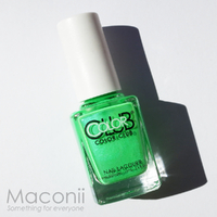 Color Club's What a Shock is a neon lime green nail polish with a subtle teal/green shimmery glow.